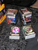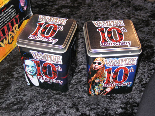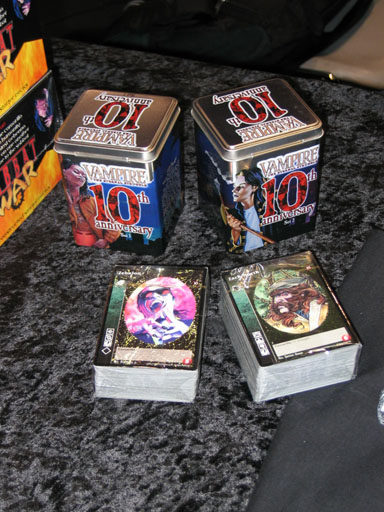 But the latest and greatest are the Vampire: The Eternal Struggle 10th Anniversary Sets. They are giving these as first place prizes to the winners of the V10 Tournament being held here. Each set has anniversary editions of a fixed selection of 90 out-of-print cards, plus anniversary editions of 10 new cards, for a total of 100 cards.